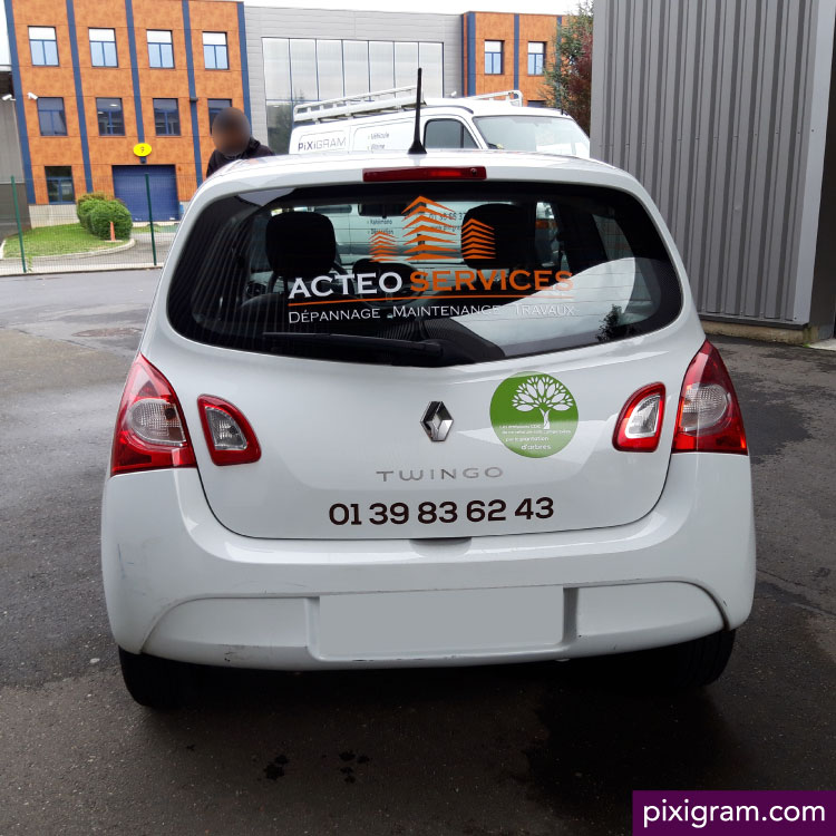 Réalisation du flocage de la flotte de véhicule de notre client Actéo Services. Marquage réalisé en impression numérique et lettrage adhésif. Pose réalisée dans nos locaux à Bois d'Arcy.